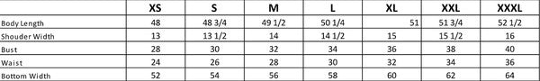 XL: 34.0 (Bust), 30.0 (Waist), null (Hips), 50.5 (Length)